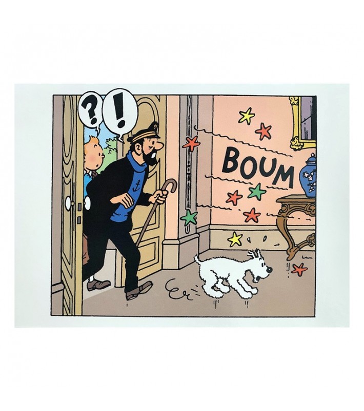Postal doble del Tintín, el capità Haddock i el Milú escoltant un fort soroll, "Boum", a l'entrar al castell de Moulinsart.