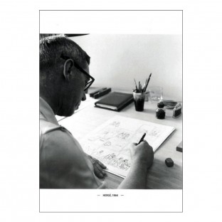 Colección de 5 postales realizadas a partir de fotografías originales de Robert Kayaert retratando a Hergé en distintas situaciones. Esta postal muestra al creador de Tintín, en 1964, dibujando una plancha de la próxima aventura.