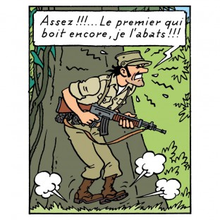 En Tintín y los Pícaros (plancha 40, viñeta C1), el general Alcázar estalla de furia contra sus tropas… ¡y con razón! Están emborrachándose con el alcohol lanzado en paracaídas por los secuaces de su rival, el general Tapioca. ¡Ay, caramba! ¡Así no hay revolución que valga!