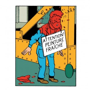 En Objetivo: la Luna (página 16, viñeta D2), Haddock acaba cubierto de pintura roja intentando atrapar a Tornasol al vuelo para evitar que caiga.