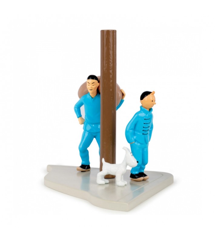 Realizada con aleación de plomo y estaño, y pintada a mano con los colores planos característicos del universo de Hergé, mide unos 14 cm de altura y está montada sobre una base sólida en forma angular.