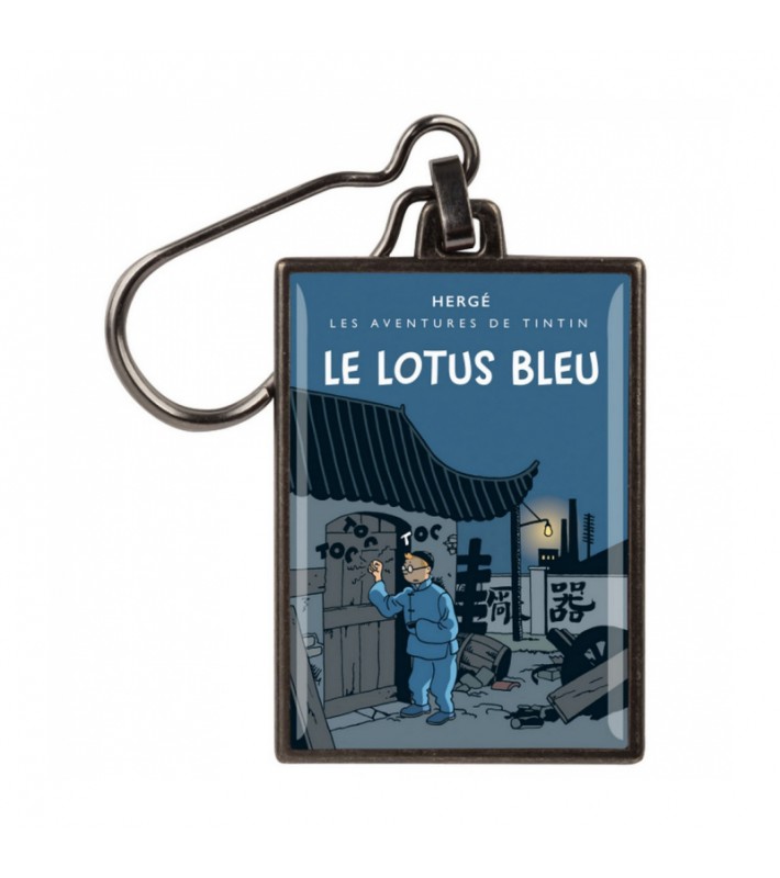 Llavero metálico de la portada de El loto azul, versión facsímil coloreada.